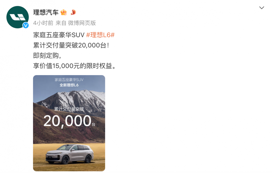 6月8日,理想汽车在官方社交媒体上宣布,其五座豪华SUV车型理想L6的累计交付量已经突破20000台。该公司表示,他们的产能将在6月份超过2万台,并且交付等待时间将进一步缩短。