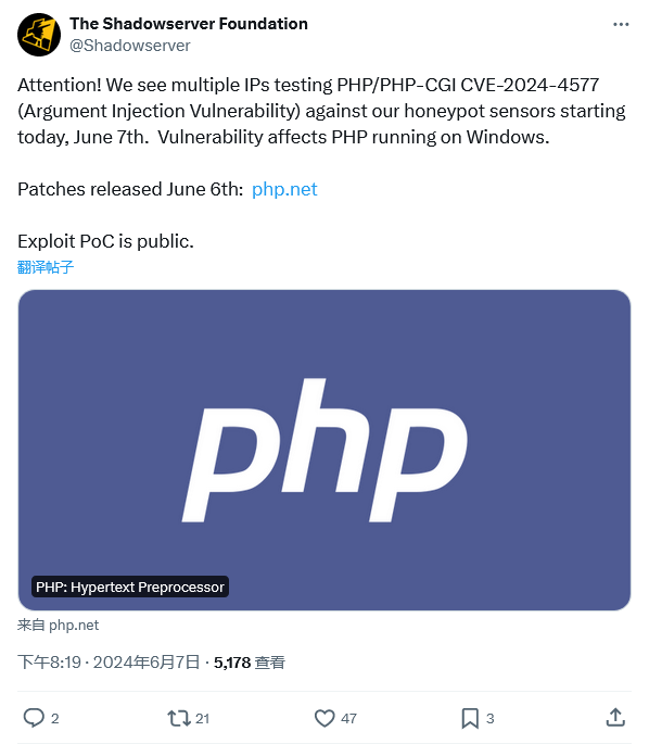 即使未配置为CGI模式的PHP可执行文件(如php.exe或php-cgi.exe)位于网络服务器可访问目录中,CVE-2024-4577仍然有可能被利用。