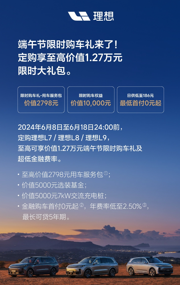 理想汽车推出端午节购车优惠,购买理想 L7、理想 L8、理想 L9 车型的消费者可享受至高价值 2798 元的用车服务包,以及价值 10,000 元的限时购车权益。购车首付 0 元起,年费率低至 2.50%,最长可贷 5 年期。