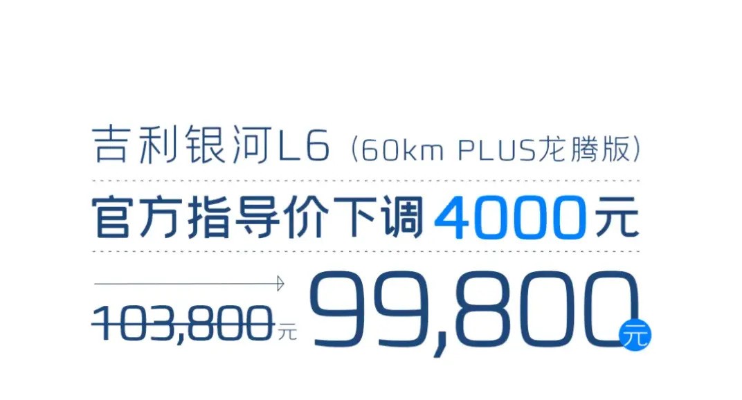 吉利汽车官方宣布,银河L6 60KM PLUS龙腾版的官方指导价下调4000元,售价调整后为9.98万元。新价格区间定在9.98-14.98万元,使该款车型更具市场竞争力。