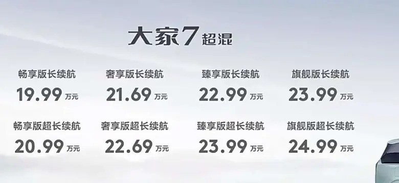 上汽大通MAXUS旗下大家7超混近日正式上市,新车共有8款车型,售价区间为19.99-24.99万元。作为一款插电混动MPV,该车号称“超懂生活的混动MPV”,配备了超大全景天幕和100%全遮光遮阳帘,可打造“星空房”。车内净高1.2m,号称“小孩宠物站的都舒适”,同时还配备了双侧电动尾门、三区独立冷暖空调、24h冷热一体电动冰箱,并支持6.6kW外放电。