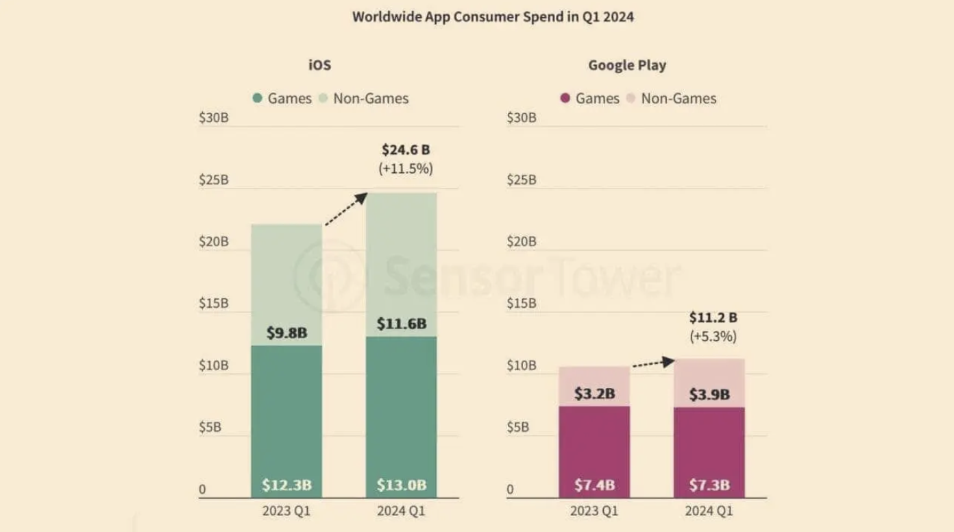 苹果和安卓平台的付费量报告显示出显著差异,尽管谷歌Play商店应用下载量远超苹果App Store(255亿次VS84亿次),但苹果在2024年第一季度的收入为112亿美元,是谷歌同期收入812.46亿元人民币的近两倍。这一差异主要源于平台用户行为和应用本身的关键差异。Sensor Tower表示,由于各平台用户付费习惯不同,并且安卓应用分发途径更广泛,导致了下载量更高,从而稀释了愿意为应用付费的群体。
