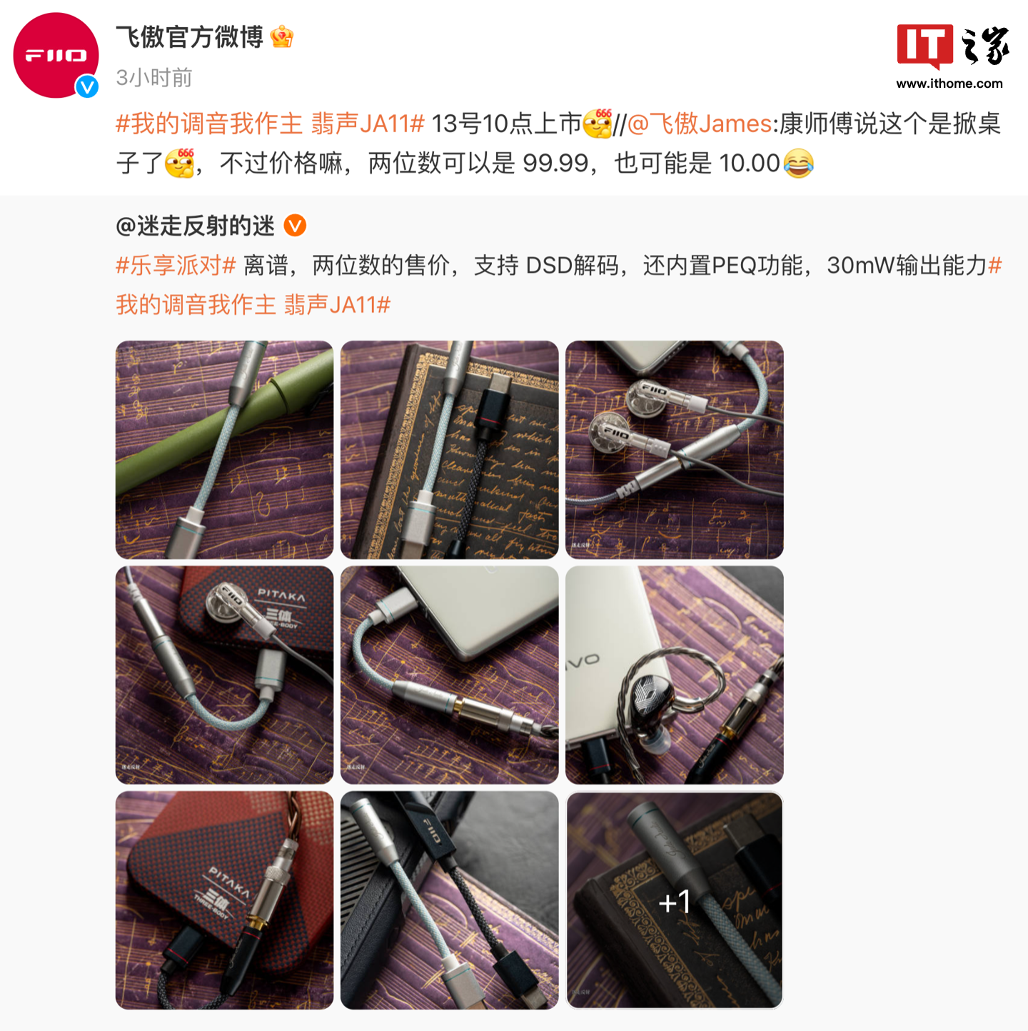 6月9日,飞傲子品牌翡声发布了新款JA11小尾巴解码耳放,并开始进行预热宣传。这款产品的价格被定为“两位数”,具体售价区间和详细硬件规格并未透露。根据博主迷走反射的迷的介绍,翡声JA11支持DSD解码、内置PEQ功能,并具备30mW的输出能力。