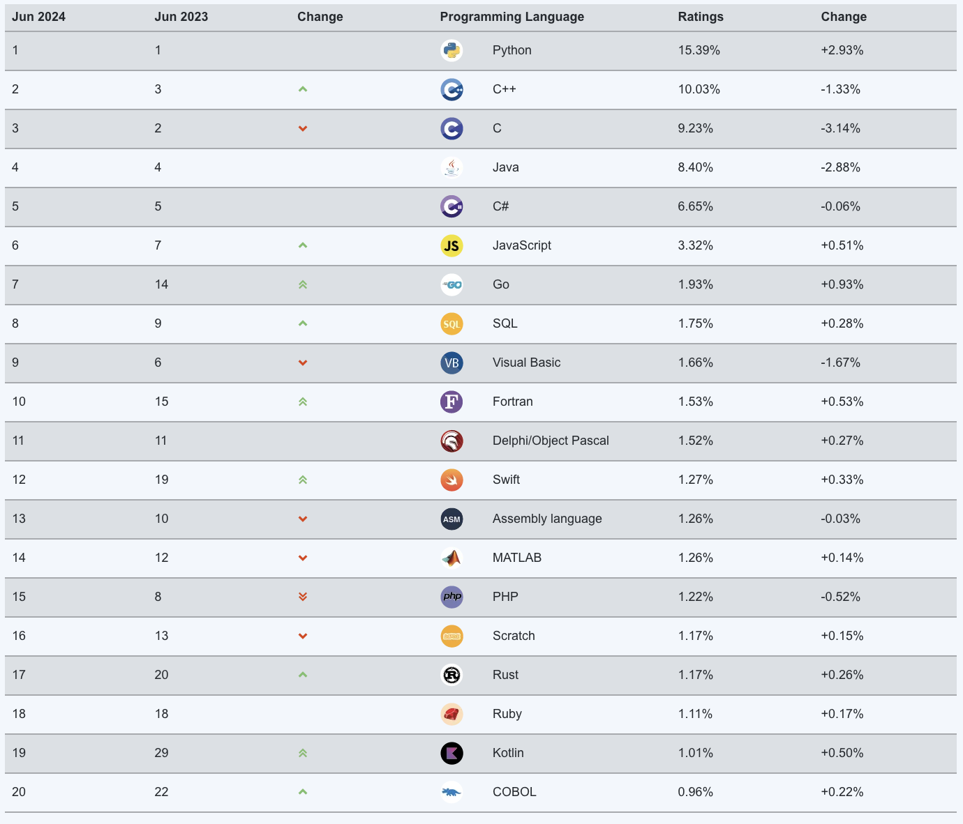 除此之外,在最新的TIOBE指数中还有其他值得关注的特点:Go语言首次进入了榜单,并位列第七;Rust语言首次上榜并名列第十七。