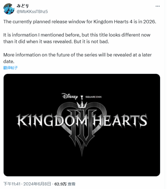 王国之心4最新消息!近日,知名舅妈みどり在X发推表示,Square Enix计划于2026年发布《王国之心4》。这一消息让无数玩家兴奋不已,因为这款游戏自两年前公布以来就备受期待。