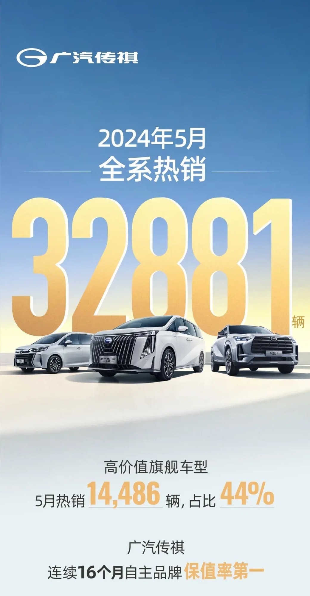广汽传祺最新发布的销量报告显示,5月份共销售32881辆汽车,其中高价值旗舰车型占总销量的44%。具体来说,传祺MPV车型在5月份售出12642辆,而影系列车型则售出10985辆。此外,广汽传祺GS3影速在5月份的热销表现为6939辆。这些数据表明广汽传祺的产品销售情况良好,并且其旗舰车型和影系列都取得了不错的业绩。
