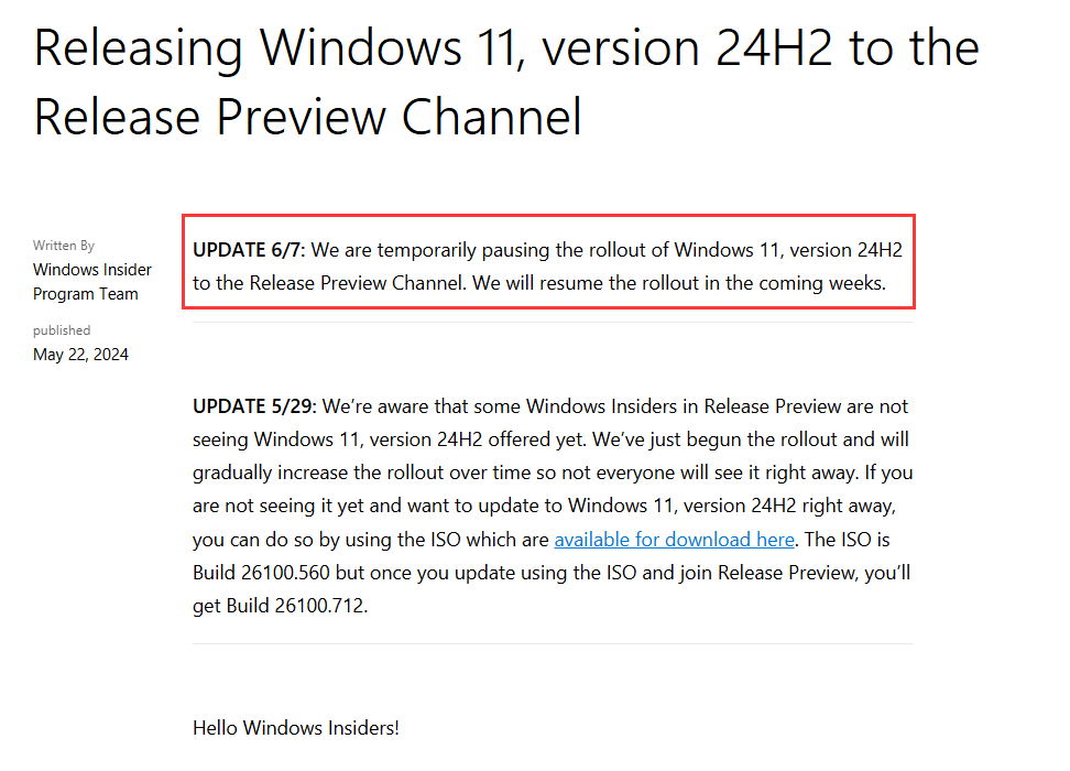 6月8日,微软面向Release Preview的预览体验成员发布了Win11 24H2(Build 26100.712)预览版更新,并开始分批推送。然而,由于某些原因,Win11 24H2的推送进度一拖再拖,最终微软宣布暂停推送,并且官方没有给出任何具体原因。目前尚不清楚这是否与微软昨天宣布的 Recall 调整有关。