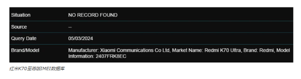 近日,小米公司最新推出的Redmi K70至尊版手机在IMEI数据库中现身,这表明该机已基本被确认即将发布。此前,这款手机在国内已经获得了3C认证,并且据说内置了5500mAh大容量电池,并支持最高120W的有线快充。