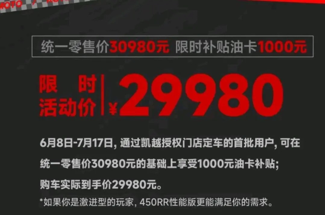 凯越450RR新玩家推出新款车型,售价29980元,订车可获赠价值1000元的加油卡。新车在设计、配置和性能方面进行了调整以适应新手驾驶者的需求。外观上延续了凯越家族的运动风格,采用黑白配色,并在两侧导流板处加以红色点缀。