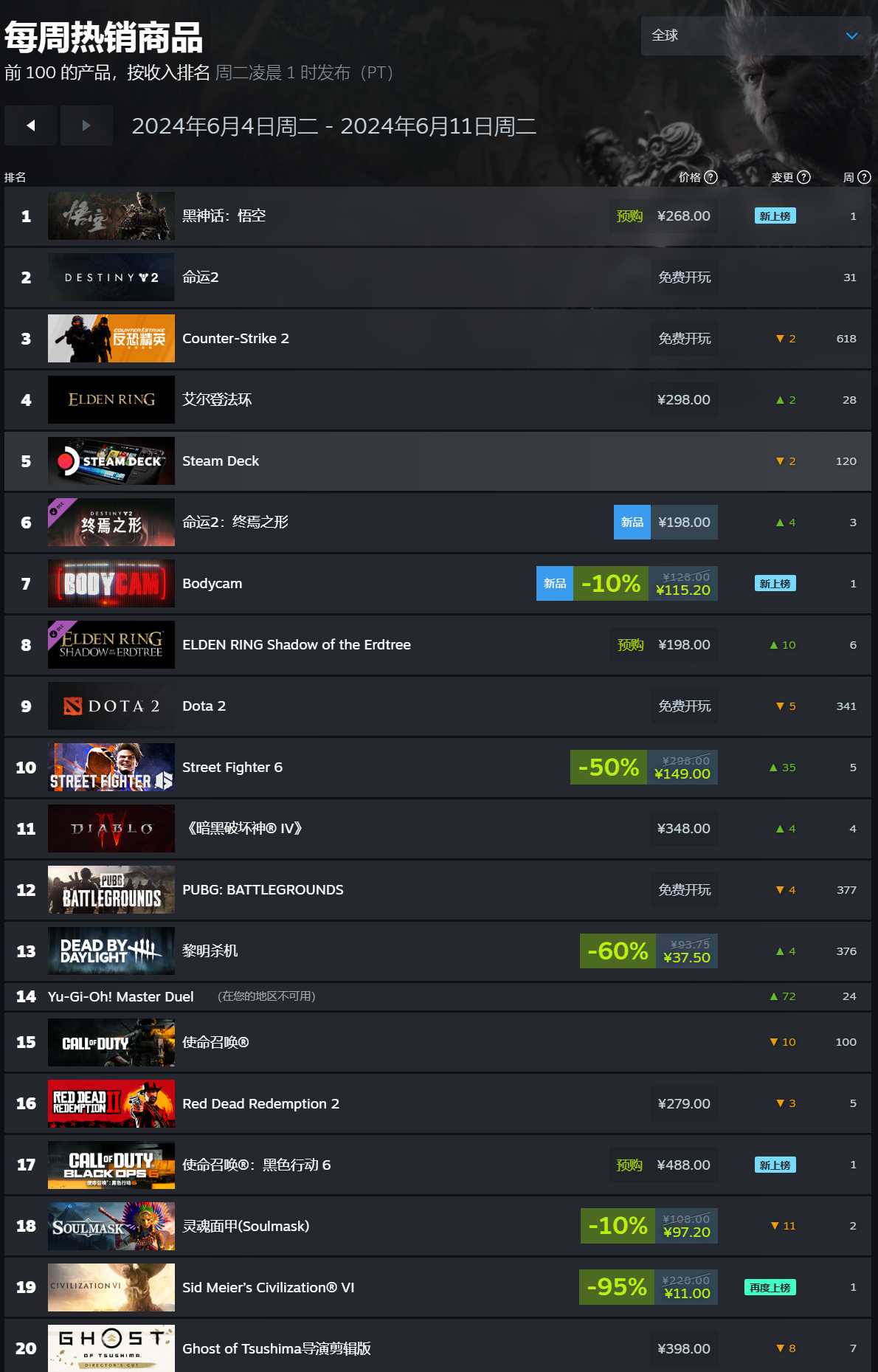 Steam最新一周销量榜出炉,2024年6月8日开启预购的《黑神话:悟空》登顶全球、国区和港区的周榜第一。