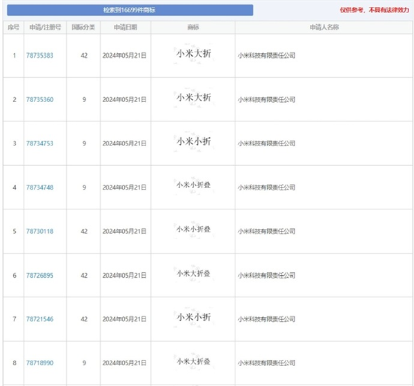 近日,中国商标网的信息显示小米科技有限责任公司已提交了一系列与折叠屏相关的商标申请。这些申请的日期均为2024年5月21日,包括“小米大折”、“小米小折”、“小米小折叠”和“小米大折叠”等。据悉,小米已经入网了全新一代折叠屏旗舰MIX Fold 4,并将搭载高通骁龙8 Gen3处理器。