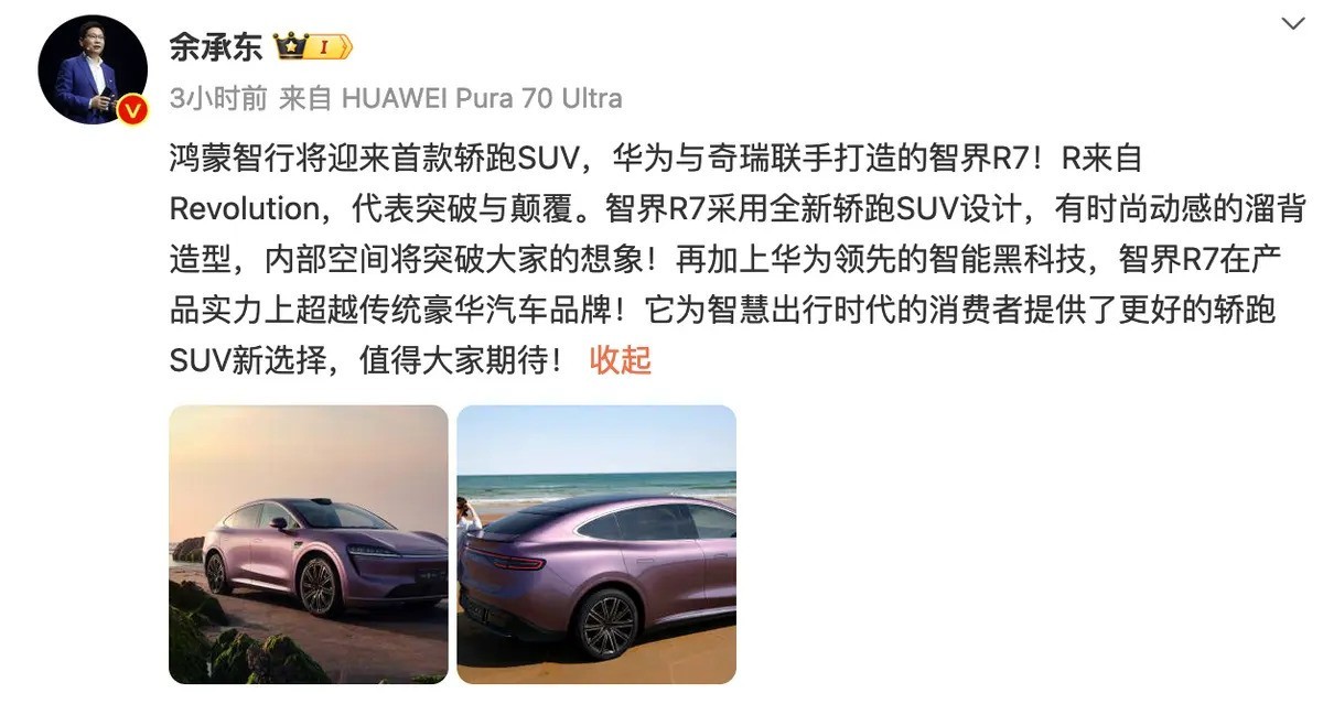 智界R7正式定名,余承东在社交媒体上表示,R代表Revolution,代表着突破与颠覆。新车将于2024年下半年发布。智界官方发布了两张关于智界R7的图片,从图中可以看出,新车的前脸设计风格与S7相似,并采用三颗泪眼大灯和封闭式前脸设计。车辆顶部搭载了激光雷达。