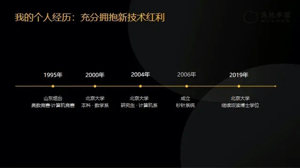 今天,我要同大家分享很重要的一个观点,就是不要着急。计算机刚刚出现的时候,每个人都说要从娃娃抓起,那时大家就很焦虑。事实上,我身边许多在世界500强企业工作的CEO,几乎都是跟我同龄时期才开始写代码的。所以,每一项新技术的出现都是有红利的,最终大家也一定都会使用到,只是接触早的人会比别人多一些机会和时间。如同《异类》一书中提出的1万小时定律,只要比别人多花一些时间做某件事情,未来就有机会享受到某领域的竞争红利。我创办的公司名为明略科技,早期叫做秒针系统,是我在北大读研究生时候创办的,开始是做互联网大数据的用户分析,后来转型做广告分析。我们是国内最早用分布式计算系统处理海量用户行为的数据公司,这也成就了今天我们在国内互联网广告数据分析的江湖地位。