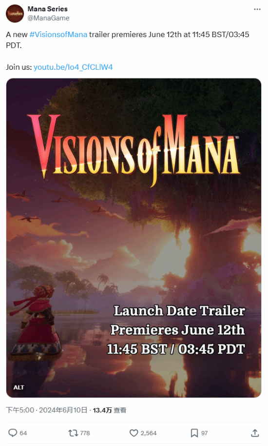 今日,SE与网易合作开发的《圣剑传说》宣布,将于北京时间6月12日18点45分发布全新的预告片。在此次发布的预告片中,将会公布游戏的发售日期。据悉,《圣剑传说》预计将在PS4、PS5、Xbox Series X|S以及PC平台上线。