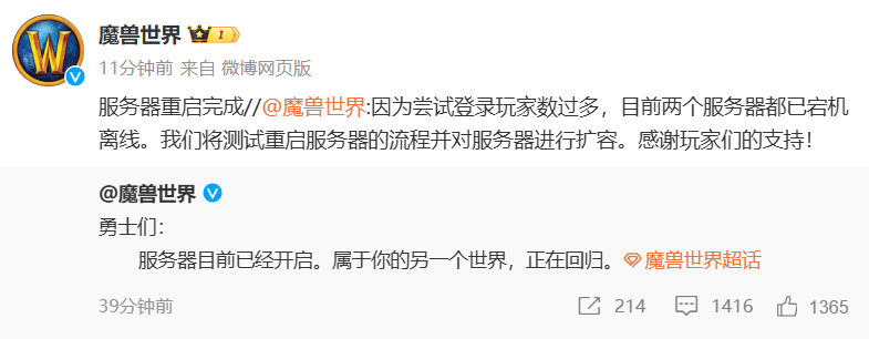 然而,开服不久后就出现了问题。许多玩家反馈称,由于服务器人数过多,“抗压一号”和“抗压二号”服务器出现了离线或排队的情况。对此,《魔兽世界》官方在官方微博下做出回应,并表示因为尝试登录玩家数过多导致两个服务器宕机。