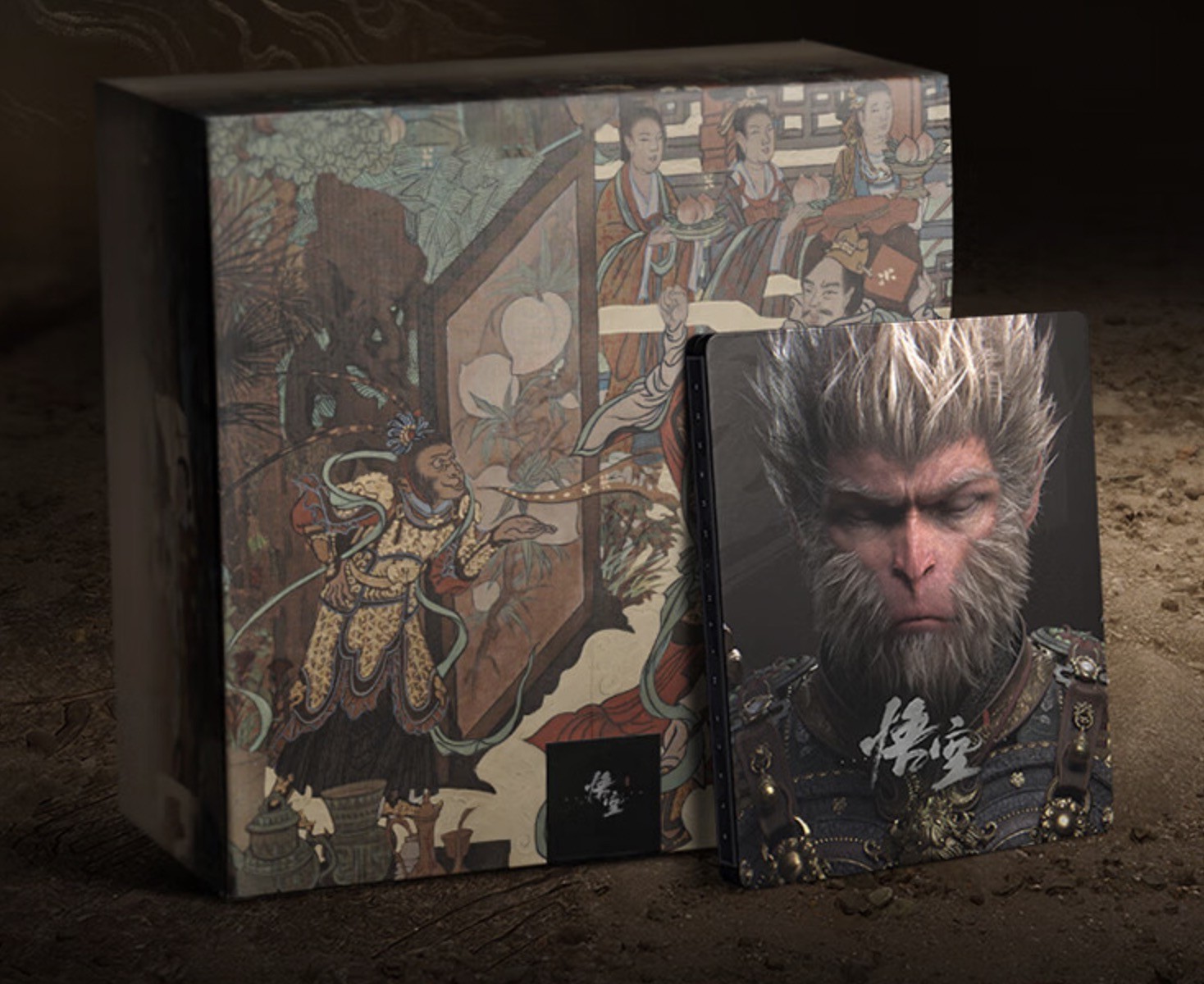 而售价为1998元的实体收藏版,在豪华版的基础上进行了升级,将紧箍替换为主角1:6可动人偶“直面天命”(40cm高),并将“乱蟠桃”画卷升级为“受心经”画卷。