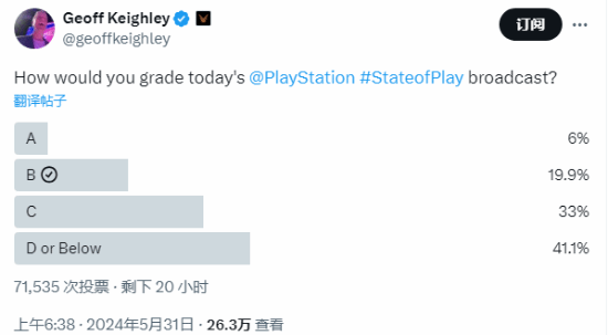 昨天,Xbox举办了一场盛大的夏季发布会,而PS在这方面的表现则相对低调。在最新的State of play发布会上结束后,TGA创始人Geoff Keighley发起了一项调查,询问玩家们对这次发布会的满意度。结果显示,超过41%的网友给出了最低评价。