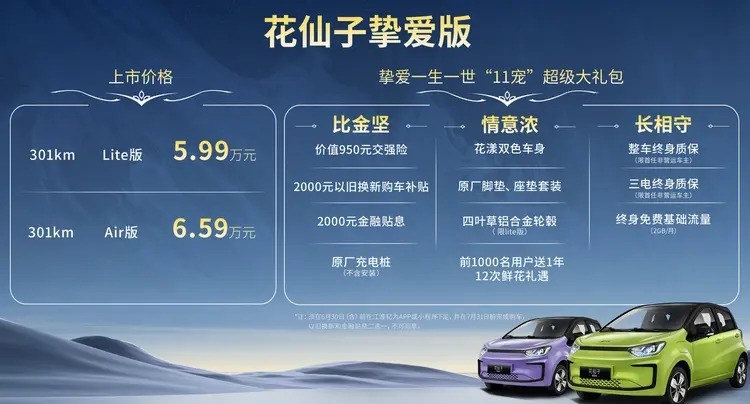 6月10日,江淮钇为官方发布了旗下车型花仙子挚爱版的上市信息。这款新车共有2款车型,售价区间为5.99-6.59万元。作为一款301km续航的微型电动车,花仙子挚爱版的起售价进一步下调。此前,该车型属于思皓品牌,但现在已整合至江淮钇为旗下。