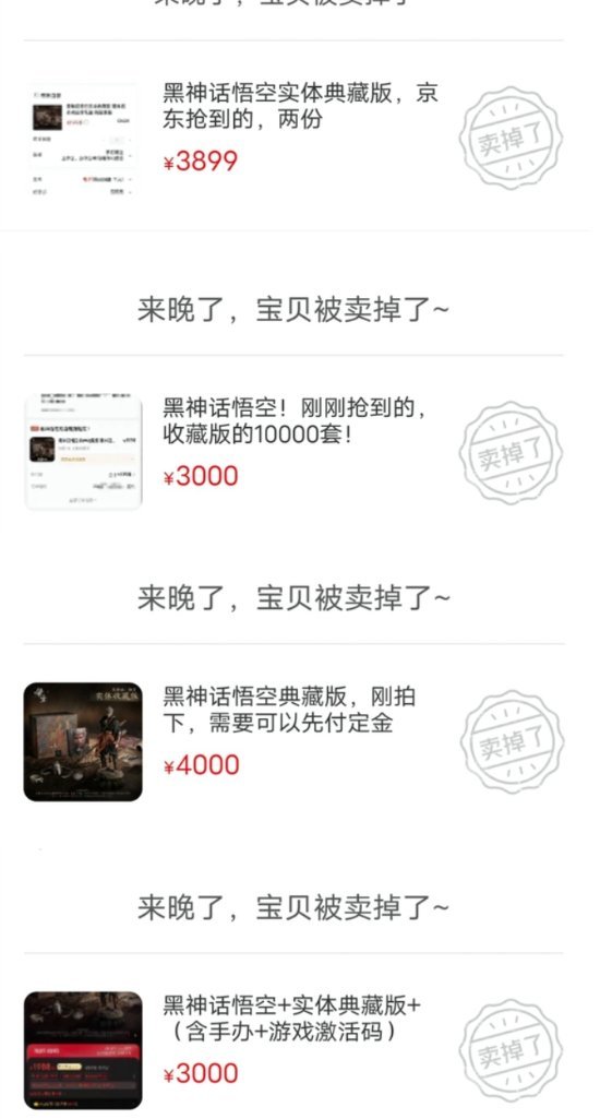 《黑神话:悟空》昨天正式在京东平台开启了全款预售,豪华版售价820元,限量20000套;收藏版售价1998元,限量10000套。不过令人惊讶的是,在预售开启仅五分钟内,所有产品就宣告售罄了。接下来,二手交易平台上出现了大量加价转卖的信息。