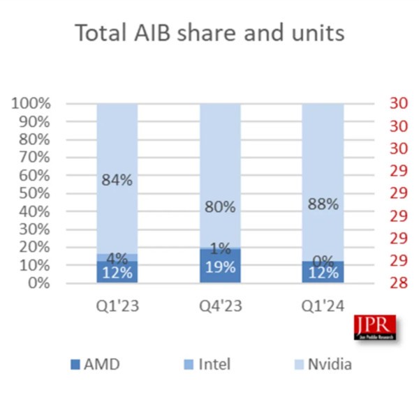 近几年显卡市场比较魔幻,挖矿过去之后,又迎来AI时代,导致显卡的价格一直居高不下。其中受益最大的,莫过于英伟达。JPR发布了2024年第一季度显卡市场调研数据,从数据中可以看到,英伟达以88%的市场份额,位居第一。当然,这个成绩也并不意外。比较意外的是英特尔独显...