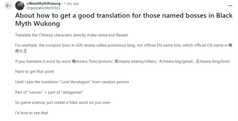 随着《黑神话:悟空》的发布日期临近,国际玩家对该游戏的热情讨论日益升温。在Reddit上,一位玩家提出了关于如何为游戏中的已命名Boss角色寻找合适译名的话题。他认为直接翻译汉字虽然直观但可能造成理解困难,如“毒敌大王”逐字翻译不易懂。他建议游戏科学团队创造新的词汇来表达。玩家们在评论区给出了各种建议,有人提议音译为“Du Di”,也有人希望找到既能保持发音又能传达意义的双语名称。