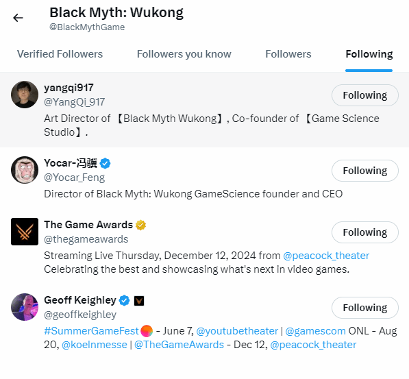 有人注意到,《黑神话:悟空》的官方推特账号关注了制作人冯骥和杨奇,以及TGA官号和夏季游戏节创始人Geoff Keighley。昨晚,夏季游戏节宣布了即将参加今年6月活动的初步参展商名单,超过55家合作伙伴已确认出席,包括国内公司米哈游、网易和腾讯等。虽然目前还未公布完整阵容,但该账号的关注可能预示着《黑神话》也将参与。让我们拭目以待。