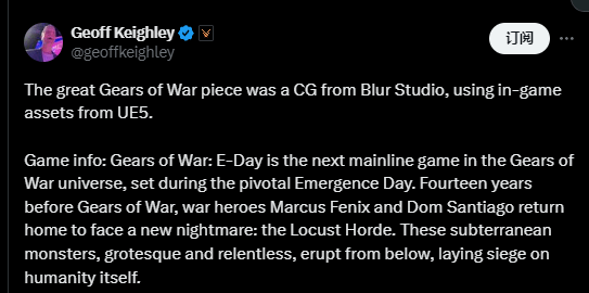 在最新发布的《战争机器:事变日》预告片中,Geoff Keighley表示该视频是由Blur Studio制作的CG,并使用了来自虚幻5引擎的游戏内资源素材。这一消息引发了外界的争议,甚至引发了一场关于游戏主机的争论。