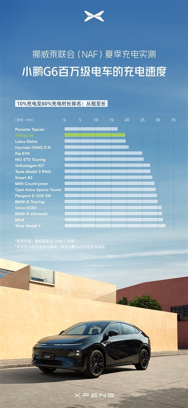 根据最新的测试数据,小鹏汽车的G6车型在挪威乘联会(NAF)的夏季26款纯电车测试中表现出色。该车凭借其出色的全域800V技术,在充电功率和充电速度两项测试中均位列前三。