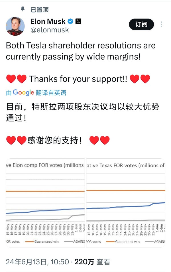 马斯克在社交媒体上发文称:“目前,特斯拉两项股东决议均以较大优势通过!”并公布了两项股东投票的比例。据悉,这次投票主要涉及两个议题:特斯拉迁往得克萨斯州总部的决定以及与2018年批准的、总额高达560亿美元(约合3625亿元人民币)的薪酬方案。