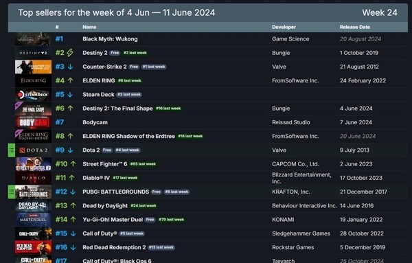 据数据网站SteamDB最新消息,国产游戏《黑神话:悟空》在6月4日至6月11日期间荣登Steam国区周销榜榜首,成功超越了《命运2》、《CS2》以及《艾尔登法环》等热门游戏。