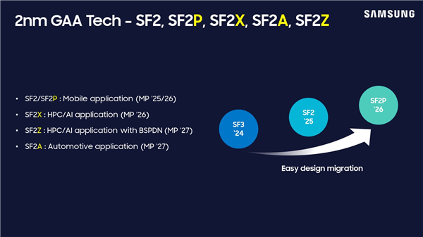 特别值得一提的是,三星的第一代2纳米技术SF2预计将于明年完成所有筹备工作,为其商业化铺平道路。而更先进的SF2Z节点则计划在2027年投入市场使用,该技术整合了创新的后端供电网络(BSPDN),旨在极大提升能源利用效率。