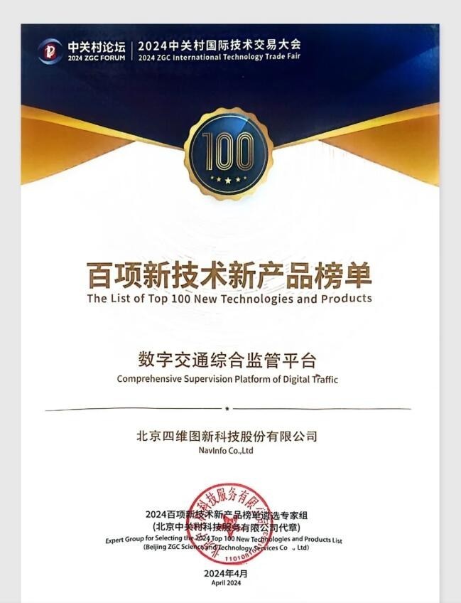日前,2024中关村论坛在京举办,在会议期间举行的中关村国际技术交易大会上,2024《百项新技术新产品榜单》正式发布。本届榜单聚焦“人工智能与集成电路”等关键产业领域,旨在展示一批世界领先原创科技成果,推动成果走向市场转化为现实生产力。四维图新“数字交通综合监管服务平台”凭借行业引领性、技术前沿性和应用广泛性等优势,从三千余项新技术新产品中脱颖而出,成功入选榜单。