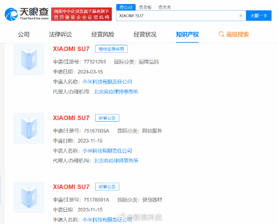 据天眼查知识产权信息,小米科技有限责任公司近期成功注册一枚名为“小米SU7”的商标。该商标属于金融物管类别,申请时间为去年11月。值得注意的是,自去年11月以来,该公司还陆续申请了多枚“小米SU7”、“XIAOMI SU7”的商标,并且其中有多枚“XIAOMI SU7”商标已经进入初审公告阶段,预计将会获得正式的注册。