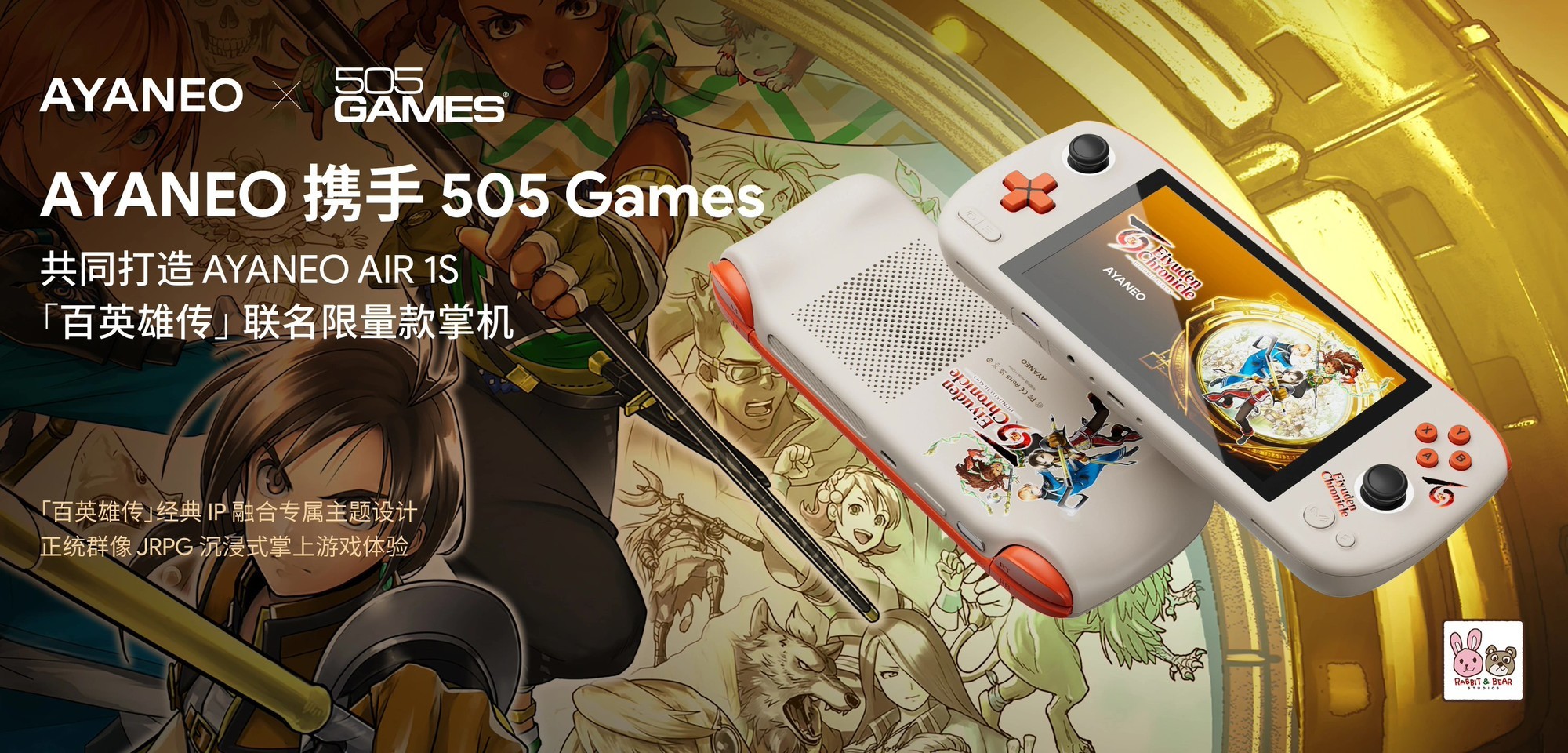 AYANEO AIR 1S 百英雄传联名限量掌机今日起接受预定,售价5299元起。这款掌机与505 Games联合推出,机身融入了游戏的标志性色彩和经典角色,并预装主题壁纸。该掌机搭载AMD Ryzen 7 8840U处理器,在插电状态下可实现25W性能释放。配置方面,配备了5.5英寸1080P AMOLED屏,霍尔摇杆+霍尔扳机和Master 全能手柄。
