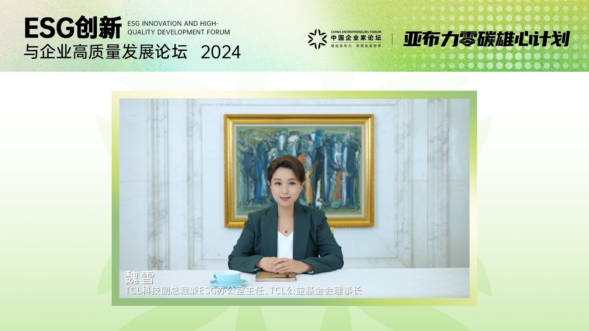 6月14日,TCL科技集团副总裁、ESG办公室主任、TCL公益基金会理事长魏雪,受邀出席“ESG创新与企业高质量发展论坛”,分享TCL在ESG领域的最新实践与创新理念,助力中国企业实现绿色可持续发展。
