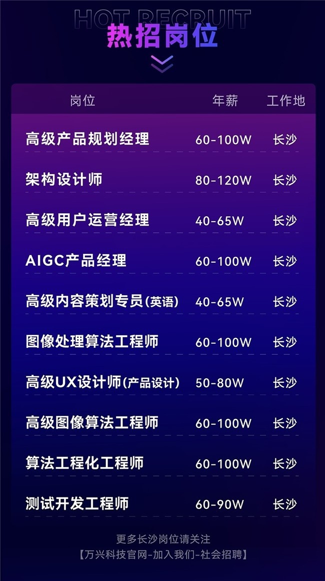 以引才入湘的代言企业万兴科技为例,其在端午期间打出“拿一线城市高薪,住长沙宜居房子,干全球软件事业”揽才理念,特别开放40+高端岗位,以百万年薪优厚待遇,邀请行业精英加入长沙万兴,共同奔赴AI发展的大时代。