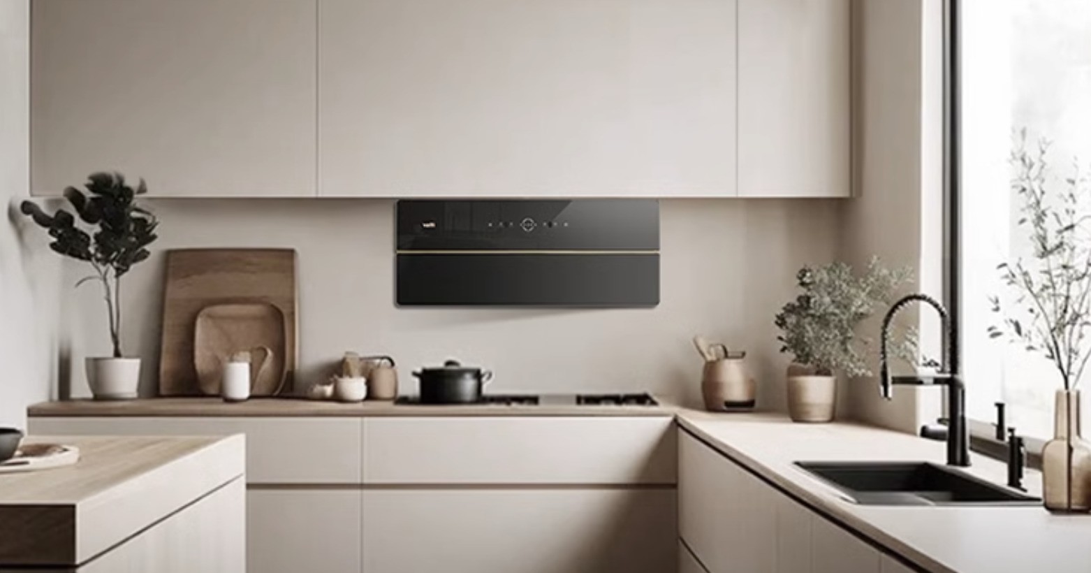 华帝 X5油烟机则才用了超薄设计,机身厚度缩短至 12.6cm,可完美嵌入到各类橱柜中,安装后对空间的侵占感更小,无论是黑色款白色款都能与不同的装修风格进行搭配。