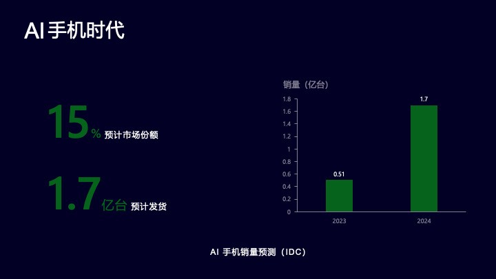 继功能机、智能手机之后,生成式AI技术催生出全新的AI手机品类,推动手机行业进入第三个重大的变革阶段。全球知名研究机构IDC预测,2024年AI手机的出货量将达到1.7亿台,占全球总销量的15%以上。AI手机已成为用户获得最新科技体验的最佳方式。