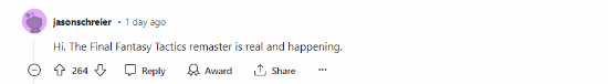 2021年泄密事件后,《最终幻想战略版:复刻版》一直备受关注。近日,知名记者Jason Schreier透露了这款游戏的存在性。此前,该游戏的制作人松野泰己曾表示目前没有复刻计划,并建议玩家向Square Enix传达他们自己的请求。然而,尽管如此,在过去几年里,松野泰己仍然参与了《最终幻想》系列的制作,他目前经营着一家专注于策划、剧本和制作的公司。