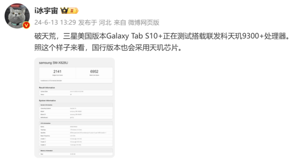 据悉,这款代号为SM-X828U的设备在Geekbench 6中取得了单核2141分、多核6952分的成绩。从下方显示的处理器核心数和频率来看,该设备应该搭载了联发科最新的天玑9300+处理器。有网友提问为什么三星不再使用定制版骁龙了,博主回应称可能是考虑到功耗和稳定性的问题。
