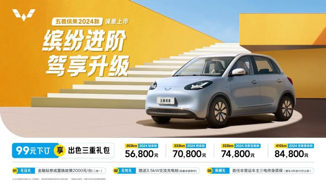 五菱汽车今日正式推出2024款五门纯电车五菱缤果,售价区间为5.68万-8.48万元。该车型在外观内饰、三电系统和驾控体验等方面进行了升级,并提供了购车福利,包括2000元金融贴息/置换补贴(二选一)、赠送3.5kw充电桩(具备安装条件)以及首任非营运车主三电终身质保政策。