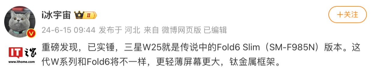 根据最新的消息,三星正在开发一款名为Galaxy Z Fold6 Slim的手机。这款手机据说采用了更轻薄的钛金属框架,并且屏幕更大。虽然博主i冰宇宙最初表示该款手机被称为Galaxy Z Fold6 Slim,但后来他确认了这款手机就是三星W25。