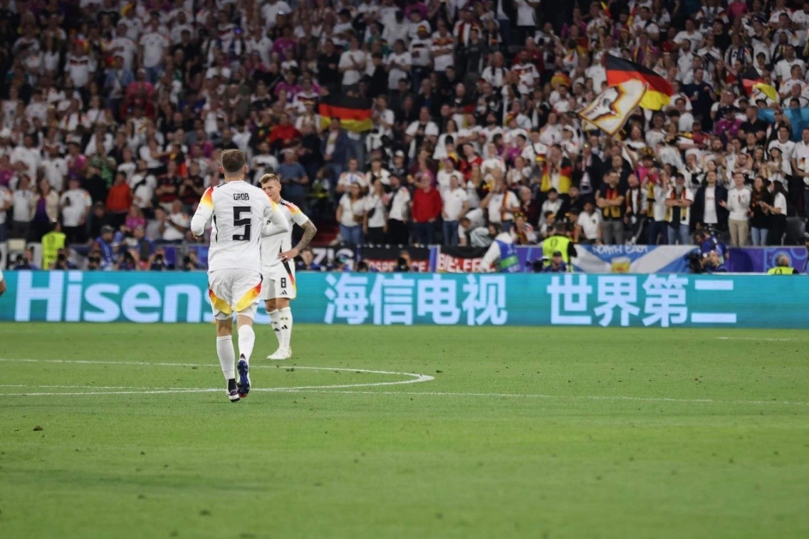 在官方赞助商身份之外,海信今年还作为2024欧洲杯VAR(视频助理裁判)提供显示技术支持,助力裁判做出更精准的判断。在德国与苏格兰的首场比赛中,海信VAR助理裁判技术给出本届欧洲杯第一张红牌第一颗点球。这是欧足联历史上首次开放VAR显示独家权益,背后是海信50余年的显示技术积淀。从品牌广告到技术合作,海信已经进入了全球化新阶段,中国显示技术在最严苛的场景中得到检验和认可。