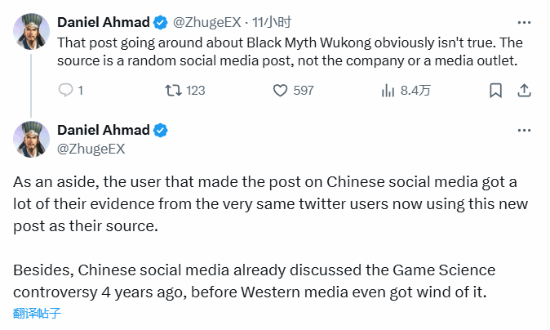 著名游戏分析师ZhugeEX发文表示:“关于《黑神话:悟空》的传闻显然不实。消息源并非专业媒体报道,而是社交媒体上的一个帖子,并且这个帖子的来源也存在争议。”他还提到,“发布该消息的人很多证据都来自同一批用户,这很可疑。”