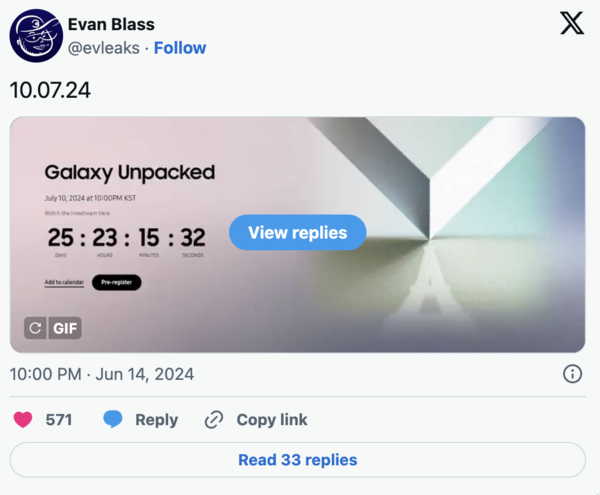 据海外博主透露,三星将在今年七月举办新品发布会,正式推出全新的折叠屏旗舰手机。虽然目前还没有官方确认的消息,但有消息称发布会将于7月10日在法国巴黎举行。