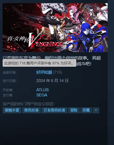 备受期待的《真·女神转生Ⅴ Vengeance》已于昨日在Steam平台正式发售,受到了玩家们的高度评价。该游戏的用户好评率达到了97%,展现了其优秀的游戏体验。