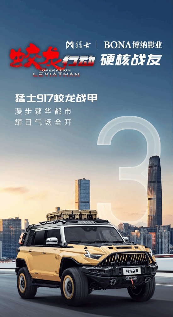 猛士科技宣布,与电影《蛟龙行动》联名的硬派越野车型猛士 917 蛟龙战甲将于 6 月 17 日开启预售。这款新车采用了沙漠风暴黄军事涂装搭配银顶撞色,配备直瀑式中网布局、龙牙仿生造型、全封闭式旋翼锻造轮毂和军车式前后宽体轮眉。值得注意的是,该车的轴距增加了10毫米,达到2960毫米。