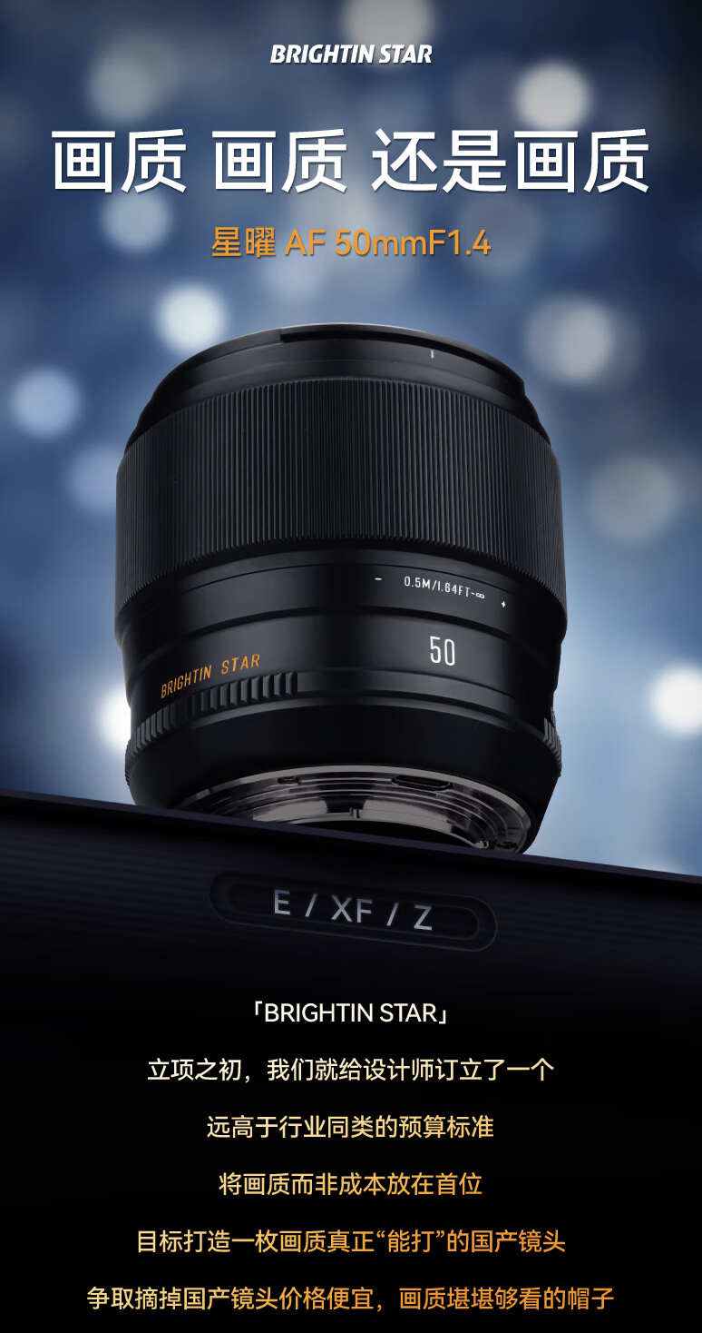 感谢网友提供的线索!星曜公司今天宣布推出一款富士X卡口AF 50mm F1.4 APSC镜头,售价为1399元。该镜头采用金属材质镜身,重量约为447克,尺寸为71.9x78.8mm。镜头的结构包括8组12片,拥有9片光圈叶片,并且最近对焦距离为0.5m。