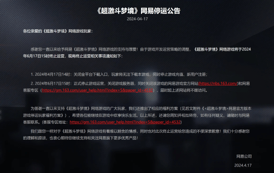网易公司自主研发的俯视角动作端游《超激斗梦境》将于明天下午3点正式关闭服务器。该游戏自2021年9月17日开启公测以来,经过近三年的运营时间。