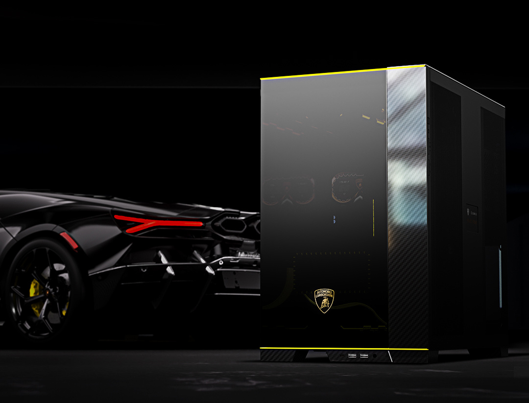 该机箱延续了原版O11D EVO RGB的270°海景房整体设计,并以兰博基尼标志性的“Giallo Orion”黄为主题色。机箱正面玻璃下部印有兰博基尼商标,正面右侧立柱表面采用碳纤维材质,右侧面板中央则嵌有包含限定编号的联名铭牌。